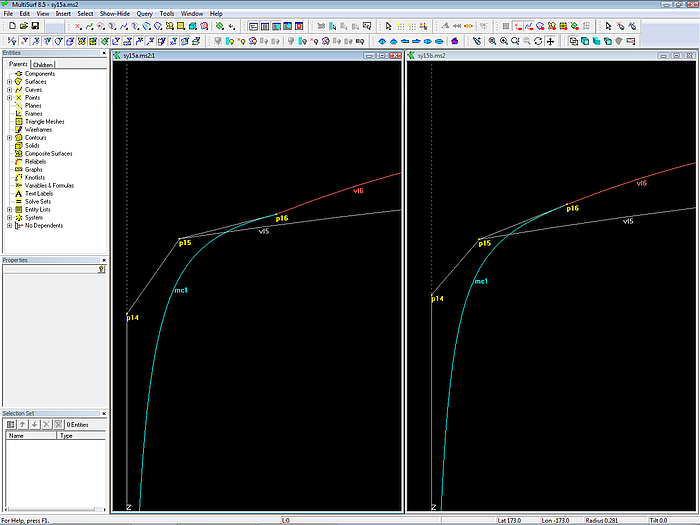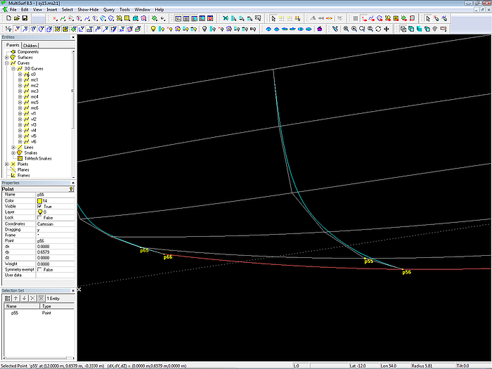 Here is how to do it better in MultiSurf. Again we make use of the tangency property of B-spline Curves. First, create a line that is tangent to vl6 in its starting point (Line between cp 6 and a Tangent Point based on Bead at t=0 on vl6). Next create a bead on this tangent line and replace with it cp 5 of the bow-mc. With this construction the tangent entry of the bow-mc to the profile of the hull is hardwired into the model.