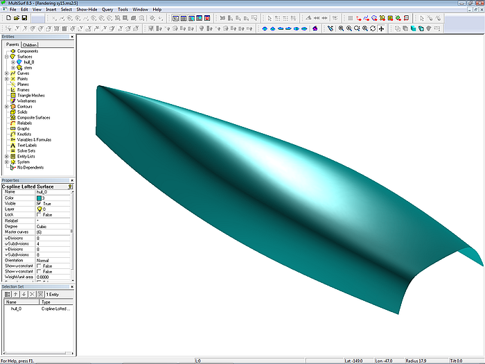 The surface type of the hull is a C-spline Lofted Surface.