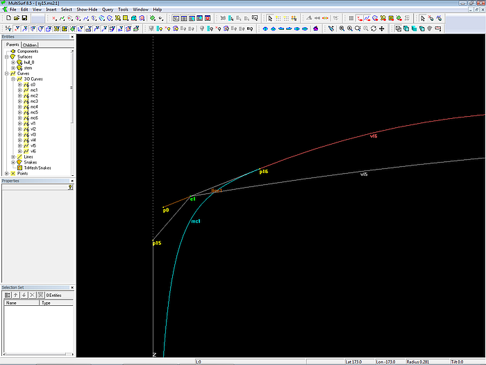So far for the model sy15.ms2. The modeling of a round bilge hull with a full length and vanishing longitudinal chine will be dealt with in following articles.