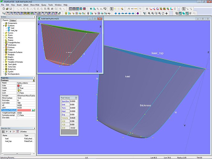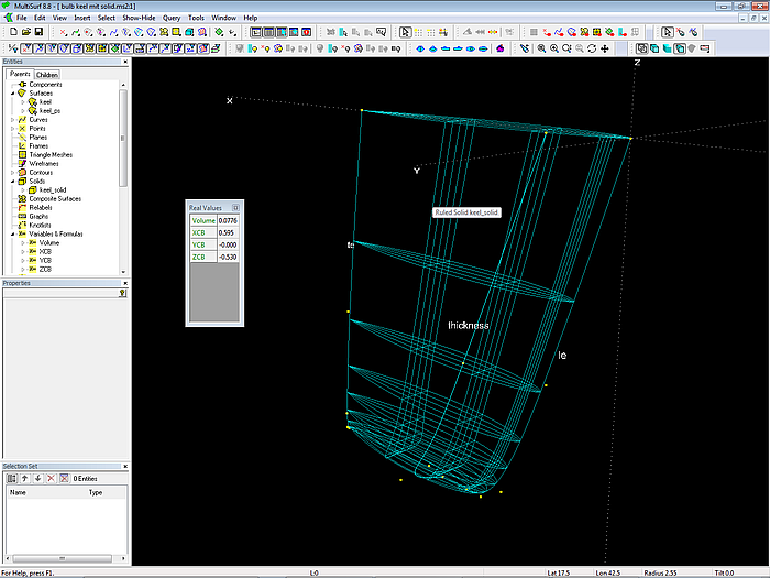 In order to create a solid the keel surface is mirrored against the centerplane (Y=0 plane), then a Ruled Solid is spanned between keel surface and its mirror image. When the solid is visible its properties are listed in the Mass Properties window.