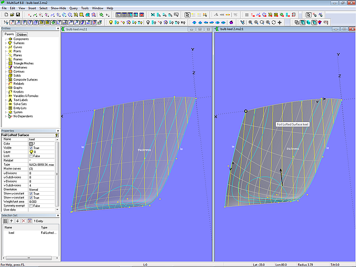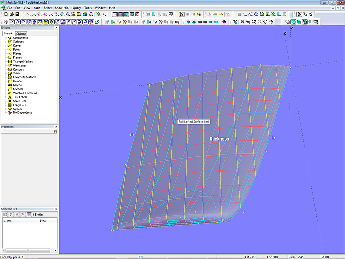 So far we considered bulbs as a separate element of the keel appendage, that is: keel = fin + bulb. However, if a more traditional keel planform is intended, then the increase of the thickness ratio towards the keel tip will also lower the center of gravity of the ballast. Model keel_foil_lofted_surface.ms2 shows an example.