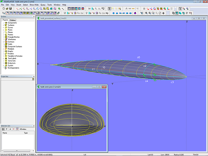 A variation of the foregoing bulb construction is shown in model bulb_procedural_surface_2.ms2. Here the bottom profile of the bulb is defined separately by a second Foil Curve. At the location of Bead e0 this Foil Curve c3 is cut in the XYZBead e3, which together with Beads e0 and e2 is used to create an ellipse (Conic c4) for the bottom of the bulb.