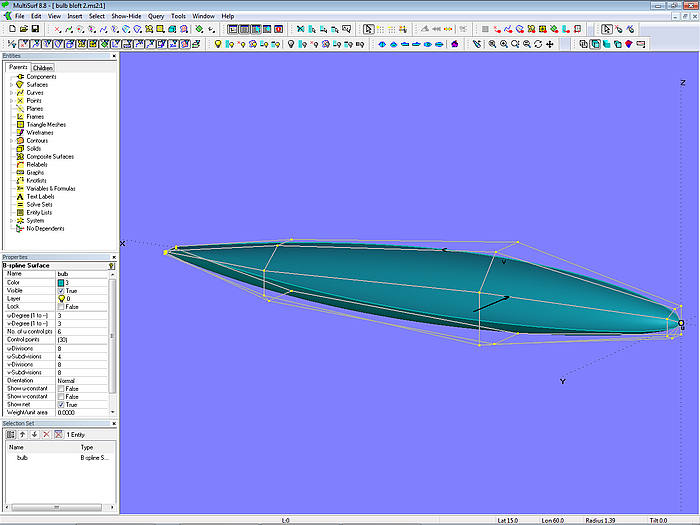 Full freedom to give the bulb any shape is provided using the B-spline Lofted Surface. An example shows model bulb_b-spline_lofted_surface.ms2. The model has 5 mcs. While mc1 at the tip is just a single point, mc2 to mc5 are B-spline Curves of degree = 3, all with 6 cps. The degree of the B-spline Lofted Surface is also 3.