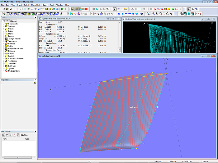The image below shows a convenient arrangement of the various windows on the screen (model keel_hydrostatics.ms2). When the Hydrostatics window is open the Offsets View window can also be minimized to get it out of way completely.