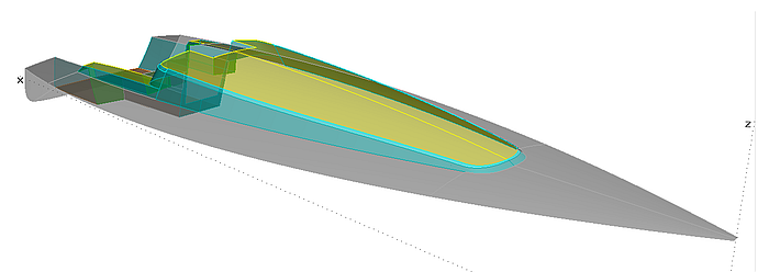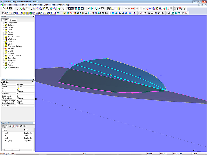 In the box-shaped design, there were separate surfaces for front, side and top. In model bubble_cabin_bloft-1.ms2 these 3 elements are formed by a single surface of the type B-spline Lofted Surface. This kind of surface allows round, soft transitions between front, side and roof.
