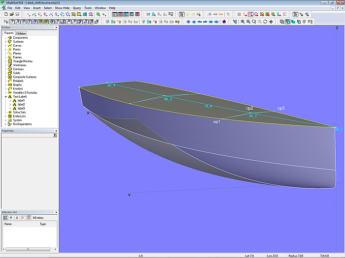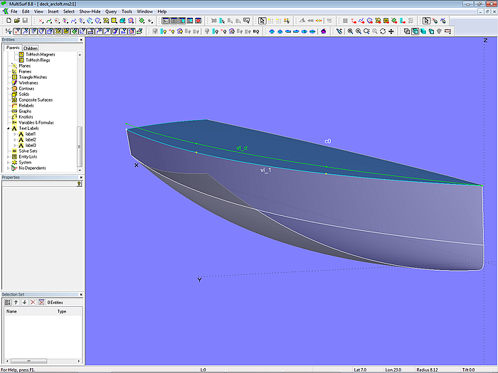 Up to now, the deck was supported by transverse mcs, similar to the hull surface. In model deck_arcloft.ms2 the longitudinal mcs vl_1, vl_d and c0 mount an Arc Lofted Surface. The curve vl_d, which is of the same type as the vertex curve vl_1 of the hull, determines the height of the deck camber; its cps lie exactly vertically above the 1st cp of the hull mcs. In order to end perpendicular to the centerplane the Arc Lofted surface is of type 5, while vl_d is projected onto it as c0.