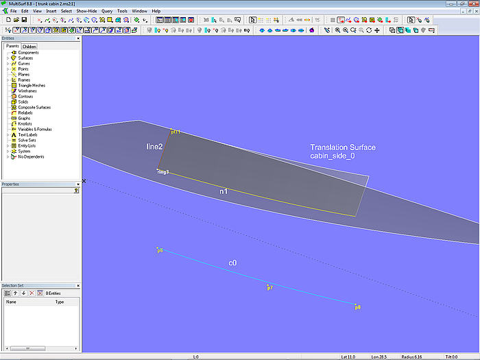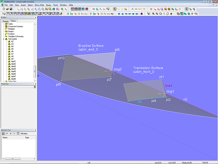 The cabin side should have a constant inward slope. It is made by a Translation Surface also. On the XY-plane the form of its lower edge is defined by the B-spline Curve c0. This one is then projected onto the deck as Projected Snake n1. At the aft end of n1 resides the Ring ring3, being support for Point pt11, which controls height and inclination. With Line line2 between ring3 and pt11 as generator and snake n1 as path the Translation Surface cabin_side_0 is determined.