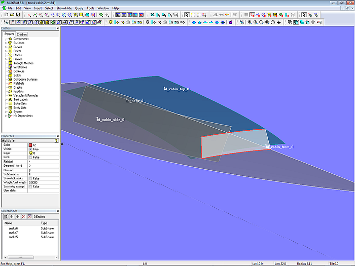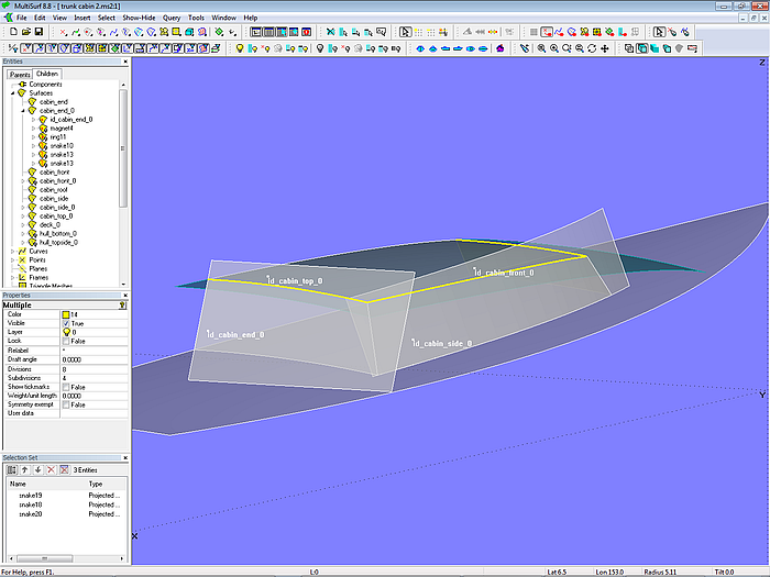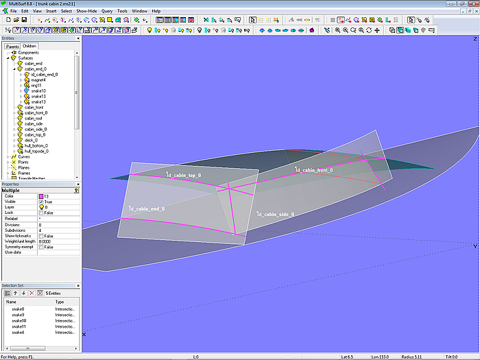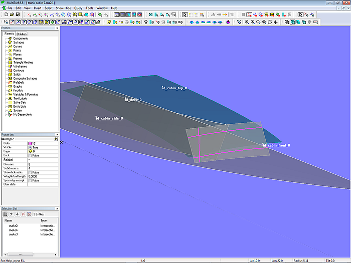 The front is cut by the roof, deck and side, resulting in 3 Intersection Snakes, all residing on the Translation Surface cabin_front_0. The extending portions of these snakes are cut off by SubSnakes serving as the boundaries of the final Trimmed Surface cabin_front.