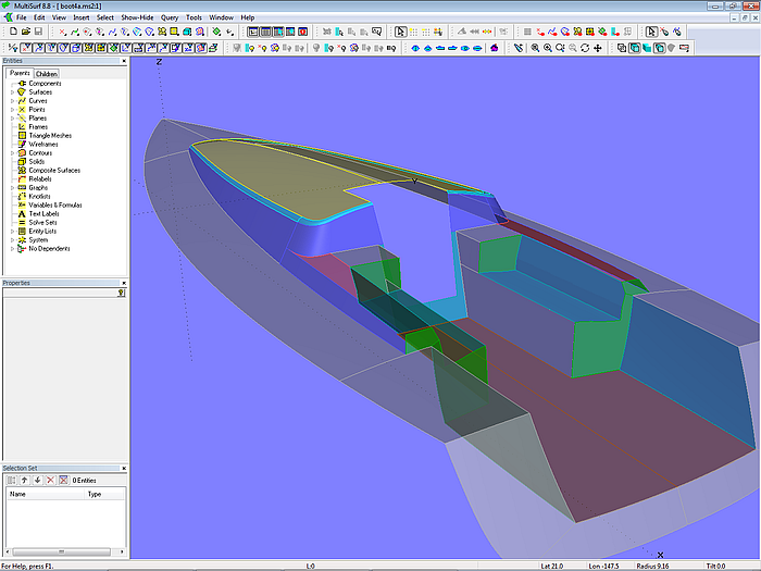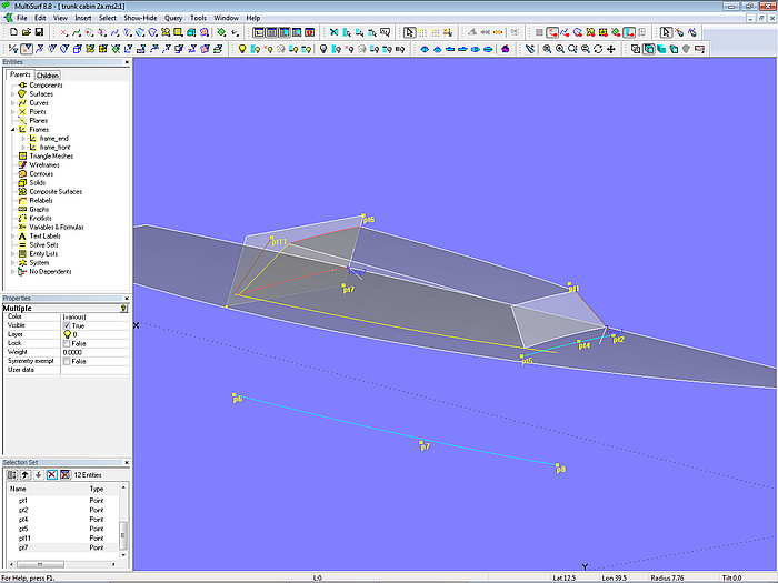In model trunk_cabin-3.ms2, on the other hand, all basis surfaces are independent of the deck. The basis surfaces are basically defined in the same way as before, but the bottom edge of the cabin is below the deck surface. The position of the front and end surfaces is defined only indirectly by the points pt2 and pt7.