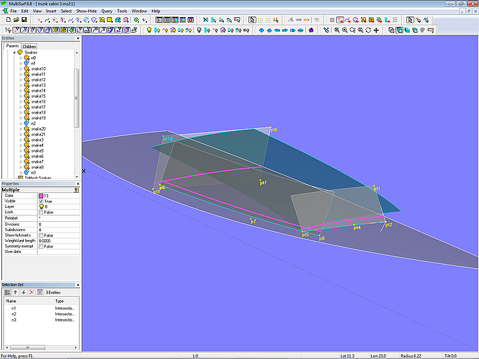 It is very convenient to maintain an Entity List which holds the objects that define the shape of the superstructure. Then you can quickly get all the points and curves on the screen, which really control form and position of the individual surfaces. Auxiliary objects such as rings for trimming intersection snakes, these themselves or their SubSnakes do not need to be displayed, these are just things which can stay in the background. Of main interest are the finished parts and the points (handles) and curves which control their shape.