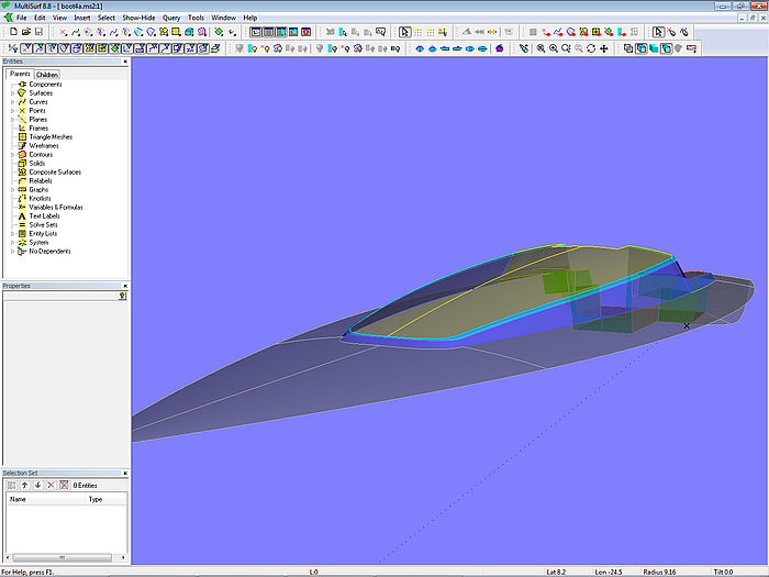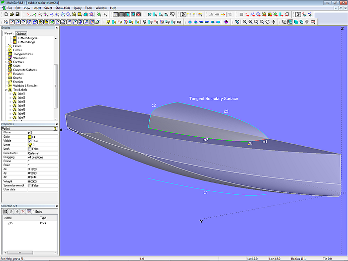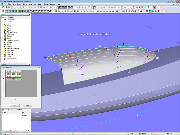 In the model bubble_cabin_tbs.ms2 the shape of the lower edge is first created as curve c1 and then projected onto the deck as Projected Snake n0. The Ring r0 divides the Projected Snake n0 into the SubSnakes n1 and n2. The aft edge is defined by the B-spline Curve c2, and the profile on centerplane is given by the B-spline curve c3. Thus, all the 4 boundary curves of the Tangent Boundary Surface are determined.