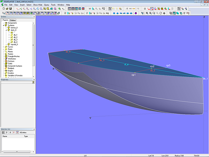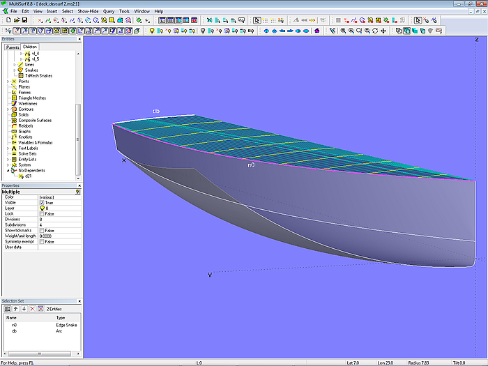 A deck can also be created by a Developable Surface. This is shown in model deck_devsurf.ms2. The Developable Surface deck_0 is stretched between the top edge of the hull (EdgeSnake n0) and a deck beam at the rear (Arc db).