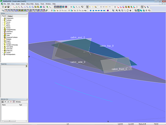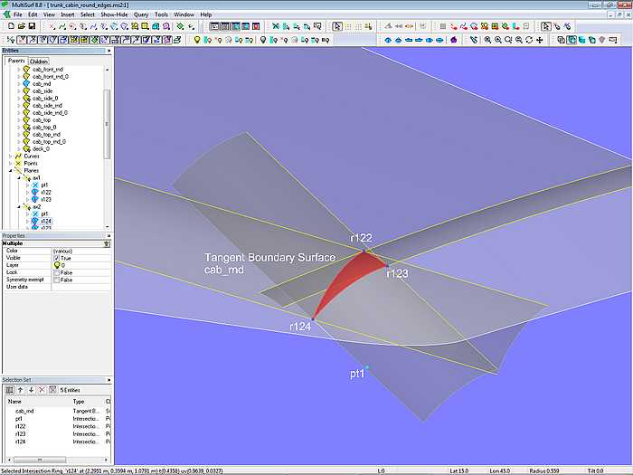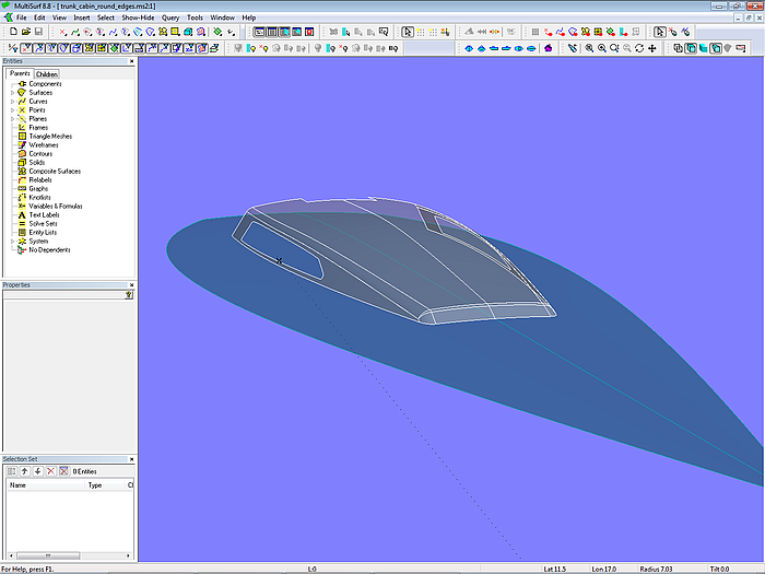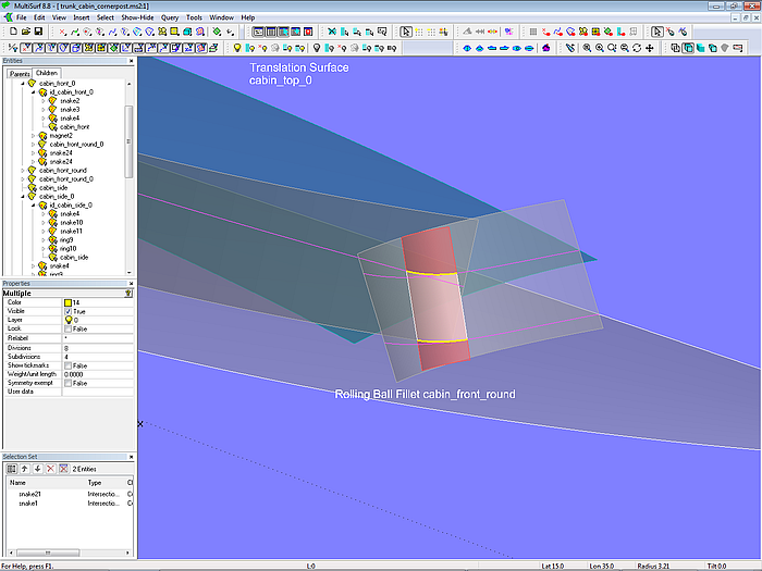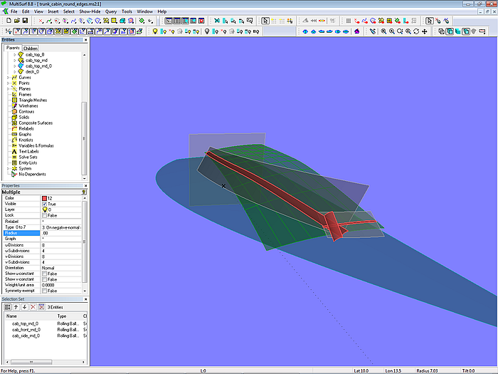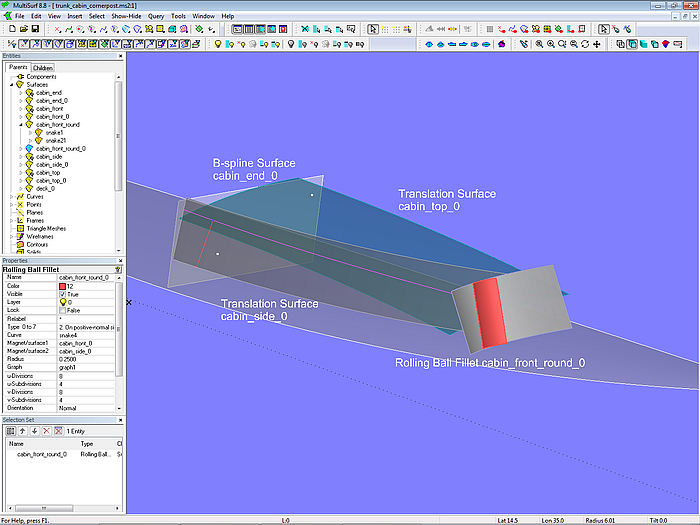 With the Rolling Ball Fillet, the edges along the cabin faces can also be rounded off. Model trunk_cabin_round_edges.ms2 shows an example.