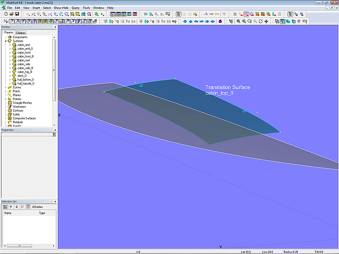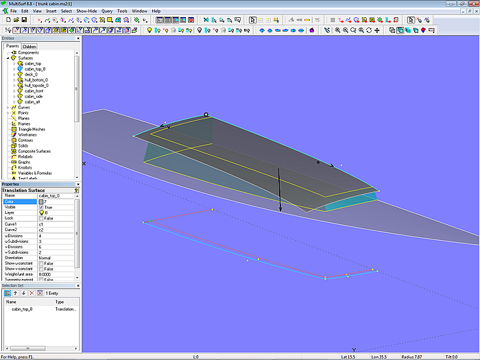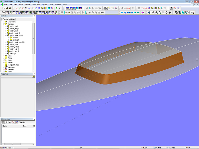 If there are geometrical specifications such as inclination of the cabin side is to be 10°, front is circular and sloped aft by 35°, a procedure as shown in model trunk_cabin-2.ms2 is convenient.