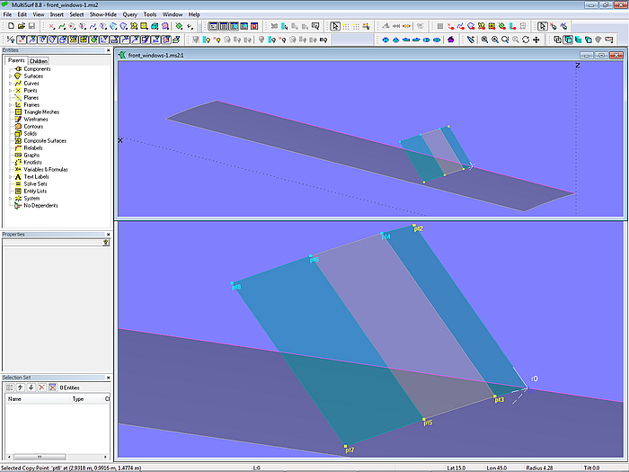 The model front_windows-1.ms2 shows the easiest way to create surfaces for front windows. The restrictions are flatness and rectangular shape.