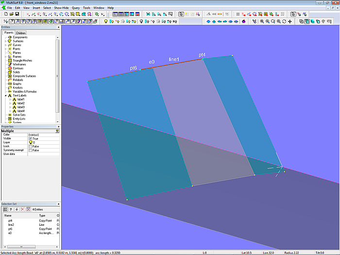 A Line (line1) is spanned between the points pt4 and pt6, and the Arc-length Bead e0 is set on it. For the B-spline Surface window2_0, the bead is then used instead point pt6. The window surface is still planar (ensured by Copy Point pt6), but you can now control the desired upper width by e0.