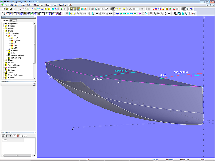 Model deck_const_pattern.ms2 shows this approach. The beam template is the curve pattern, which is defined at the bow front as an Arc. The upper edge of the hull is the EdgeSnake n0. On this lies the Ring d_sheer. Now the curve pattern is cut in the Intersection Bead d_e0, where the intersection plane is parallel to the midship plane while passing through d_sheer. The portion from midship to d_e0 (SubCurve sub_pattern) is finally copied to the position of d_sheer (Copy Curve moving_cv). The Procedural Surface deck_0 repeats this construction for all positions of d_sheer.