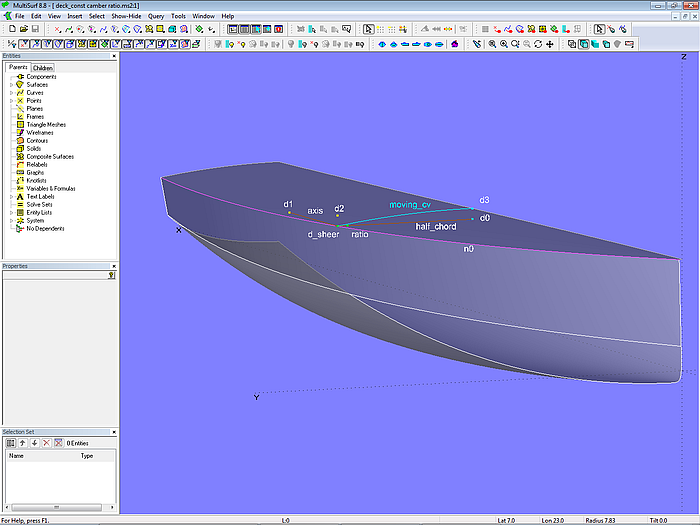 The construction is again driven by Ring d_sheer, which lies on the top edge of the hull (EdgeSnake n0). This ring is projected onto the centerplane (Y = 0) in Projected Point d0. The Line half_chord between d_sheer and d0 is half the deck width at the position of d_sheer. Now the Bead ratio is set on this line whose t-parameter value is half the camber ratio. If the camber ratio is, for example, 15%, the t-value for ratio must be set to 0.075. (The position of a Bead on a line corresponds to the value of its parameter t, for t = 0.33 the Bead is at1/3 of the length, for t = 0.5 at the half, etc.)