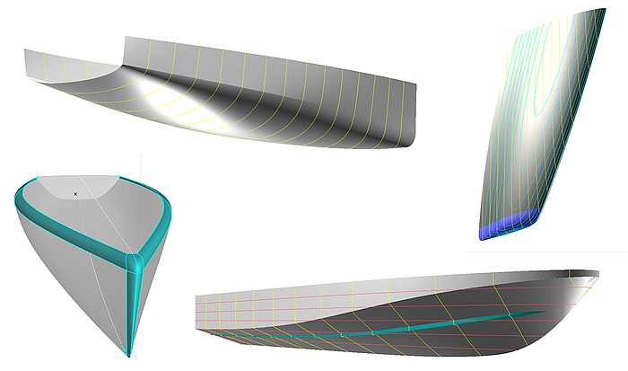 Form features are special properties of geometry that, from the designer's perspective, are necessary for the functioning of his design. For example, a full length chine in the hull surface, a tunnel in the bottom, a characteristic hull-deck rounding. In the following, methods are described of how frequently required shape properties of hull, deck and keel can be modeled. Some designs have been covered in previous tutorials. However, they are listed here to create a comprehensive collection.