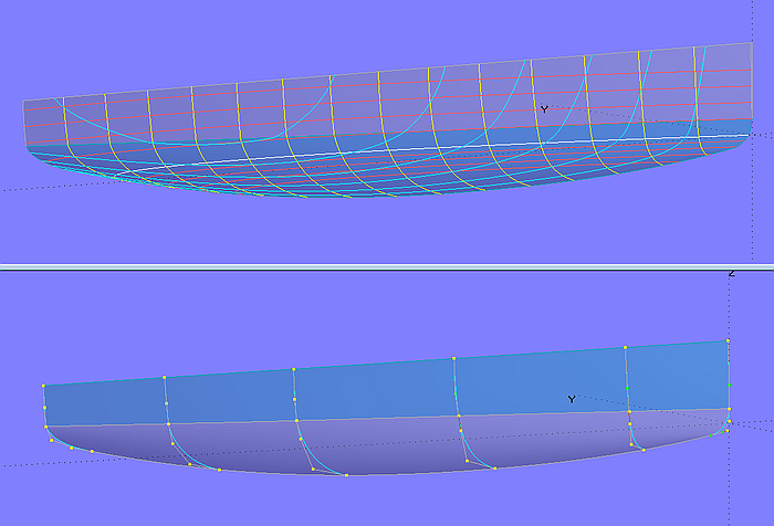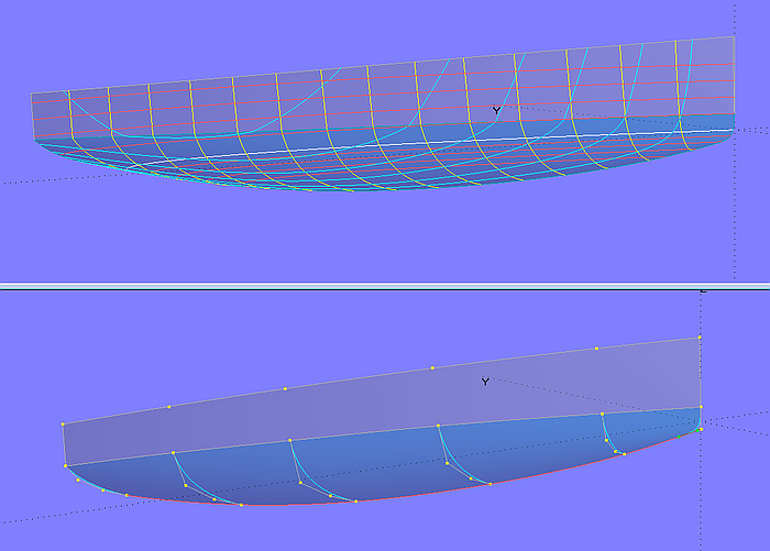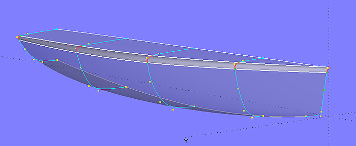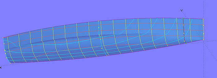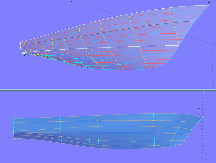 The C-spline Lofted Surface hull_0 (5 mcs with 5 cps each) is the starting point. The deck surface deck_0 is also a C-spline Lofted Surface with the same number of master curves. With every deck-mc, the first cp lies as XYZBead on the corresponding hull-mc, namely by the height of the washrail below the first cp of the hull-mc. This arrangement has the advantage that one can see the final freeboard when modeling the hull.