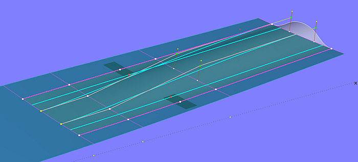 The edge mcs are B-spline Snakes on the bottom surface. The two mcs in the middle are B-spline Curves, shaping size and run of the tunnel top in transverse and longitudinal direction. The tangent attachment of the tunnel surface to the bottom base surface is hard-wired by two Procedural Curves. Their construction ensures that each curve point of these two mcs lies on the tangent plane of the corresponding curve point on the respective adjacent edge mc.