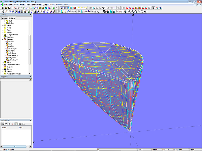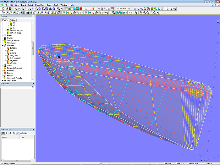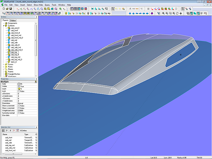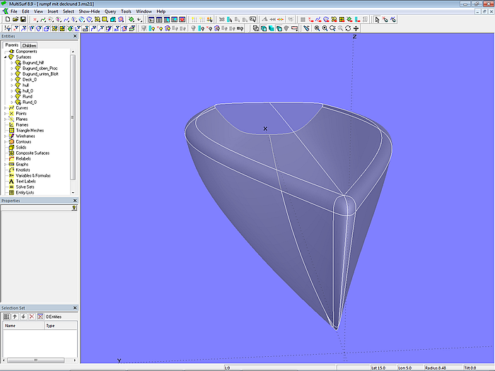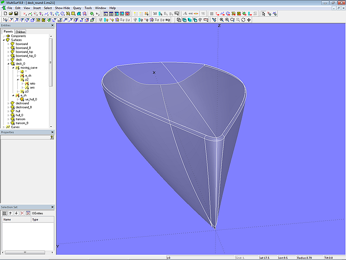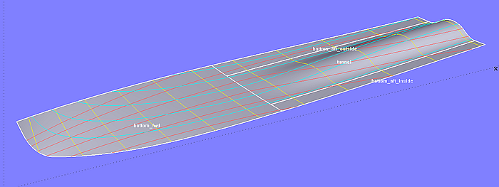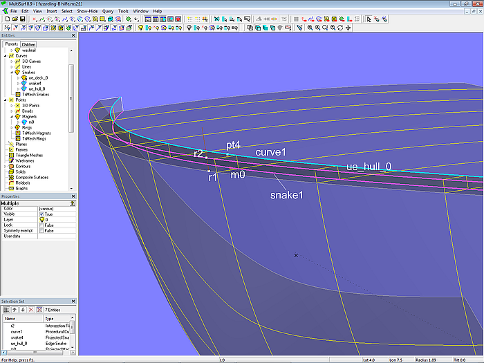 The base surfaces of hull and deck (hull_0; deck) are C-spline Lofted Surfaces with 5 B-spline master curves each. This type of surface is also used for the base surface of the rounding between hull and deck (deckround_0).