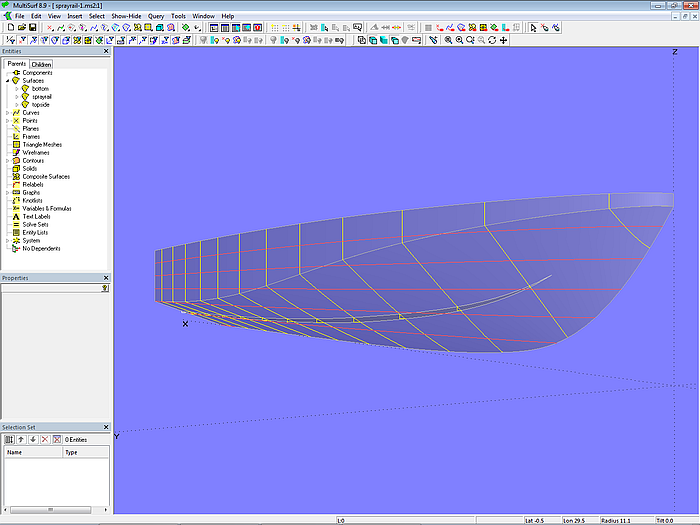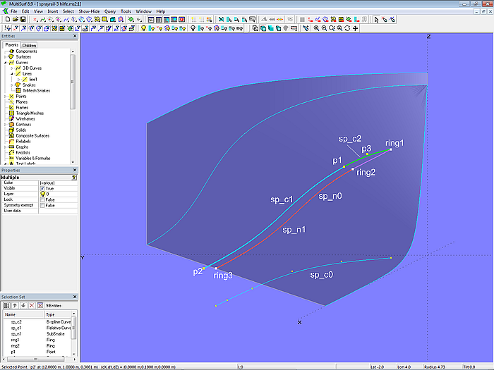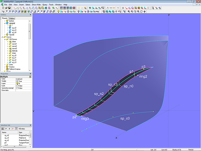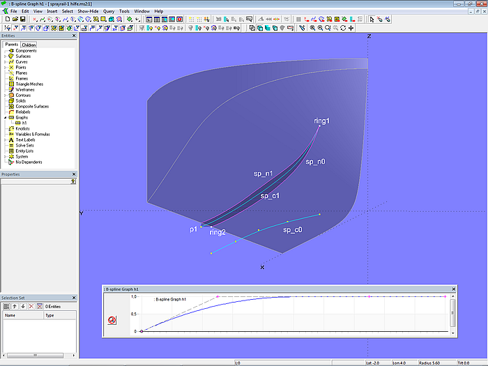 In model sprayrail-1.ms2 the starting point for the inside edge of the sprayrail is B-spline Curve sp_c0. It lies in the XY-plane and is projected onto the bottom of the hull as Projected Snake sp_n0. The Ring ring1 is located at the start point (t = 0) of sp_n0, the Ring ring2 at the end point (t = 1). The width of the sprayrail is determined by Point p1, which is offset in the Y-direction to ring2.