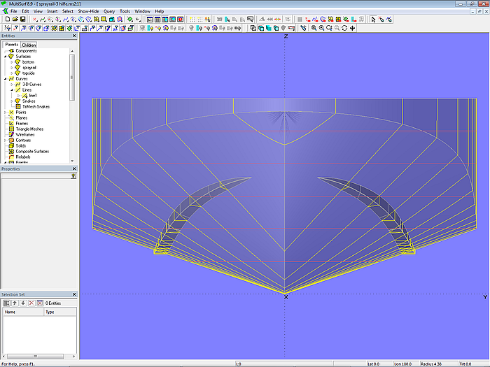 In tutorial 8 “On the rounding of bows, sterns, sharp waterlines and on the attachment of keels” different constructions for bow rounding are presented. The method preferred by the author will now be shown by means of the model tangent_bowround-2.ms2.