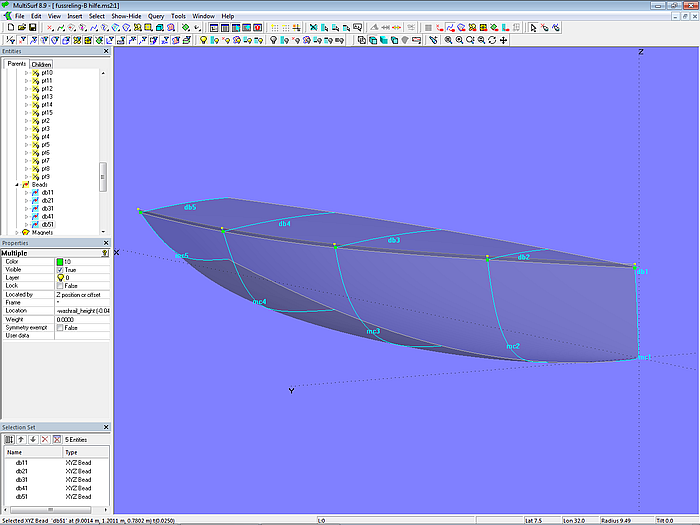 In the two preceding modeling tasks, the hull consists of two partial surfaces which adjoin one another along the longitudinal chine or its extension. In model dinghy.ms2 the hull is one single C-spline Lofted Surface. The master curves run from the sheer of the hull to the bottom contour.