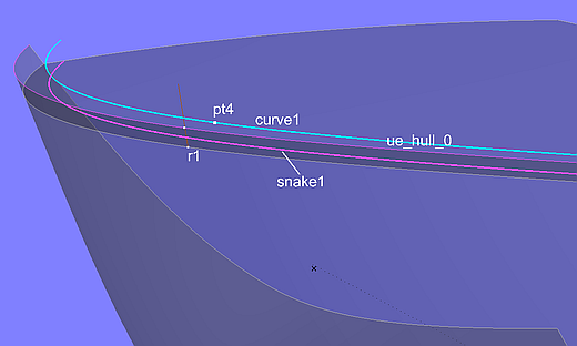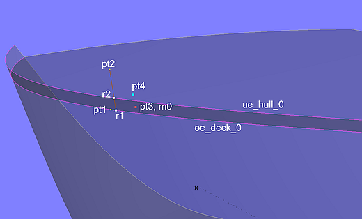 At the position of Ring r1, the upper edge of the hull (EdgeSnake ue_hull_0) is then cut in XYZRing r2. With the three points r1, m0 and r2 generated in this way, the point pt4 is defined as Copy Point.