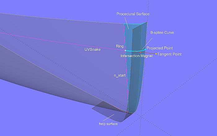 The Ring ring1 is located on the snake n_start, which determines the beginning of the bow rounding, as a support for a longitudinal UVSnake. The tangent at the position of ring1 is then created with the help of Tangent Point pt3 on this snake. The Line from ring1 to pt3 intersects the stem help surface (perpendicular to the midship plane) in the Intersection Magnet m3. This Intersection Magnet is then projected onto the midship plane as Projected Point pt4. The points ring1, m3 and pt4 are now the parents of the B-spline Curve curve1. Finally, the construction of this curve is repeated by a Procedural Surface for all positions of ring1. That is, the moving curve of the Procedural Surface is curve1, the driving point is ring1.