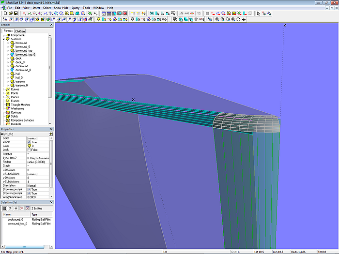Model deck_round-1.ms2 demonstrates how the edge between deck and hull can be rounded off using surfaces of the type Rolling Ball Fillet.