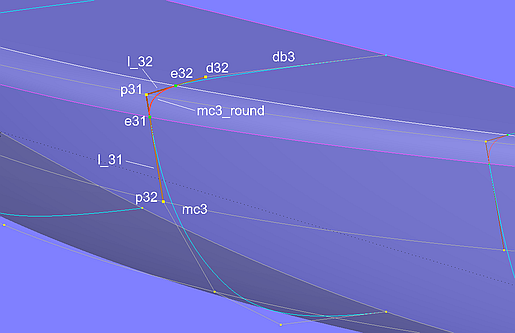 Let us take mastercurve 3 as an example. The B-spline Curve mc3_round is defined with the Bead e31, the Point p31 and the Bead e32. e31 lies on Line l_31, which connects Point p31 and p32 (cp1 and cp2 of the hull-mc). The Bead e32 is on Line l_32 between Point p31 and Point d32, the cp2 of the deck-mc.