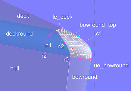 The rounding bowround_top, which creates the transition between bow rounding (bowround), deck (deck) and hull-deck rounding (deckround_0), is a Tangent Boundary Surface. Its definition requires 4 curves. Curve1 is the EdgeSnake le_deck along the front edge of the deck (deck), curve2 is the B-spline Curve c1 on the midship plane, which runs tangentially to both deck and bow centerlines with the help of 2 Tangent Points. Curve3 is the EdgeSnake ue_bowround, the upper edge of the bow rounding surface bowround. Curve4 is the B-spline Snake n2, which defines the entry of bowround_top into the hull-deck rounding deckround_0. By specifying appropriate boundary conditions, the Tangent Boundary Surface bowround_top runs tangentially to the bow rounding, to the hull-deck rounding and to the deck as well as normal to the midship plane.