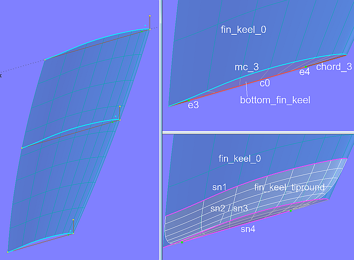 The master curves of the keel fin fin_keel_0 are Foil Curves. Their curve velocity in relation to t is zero at the leading edge (t = 1). This is passed on to all dependent snakes. Therefore three of the snakes defining the Blend Surface (Line Snake sn1 and Edge Snakes sn2 and sn3) also have a curve velocity of zero at the leading edge (t = 1). For a harmonic shape of the Blend Surface fin_keel_tipround this must also be the case with the fourth snake (sn4). It is EdgeSnake of the Ruled Surface bottom_fin_keel_0, which is spanned between the lower keel mc mc_3 and the SubCurve c0. If the curve velocity of c0 is zero at the (t = 1) end, this will be passed on to sn4 as EdgeSnake.