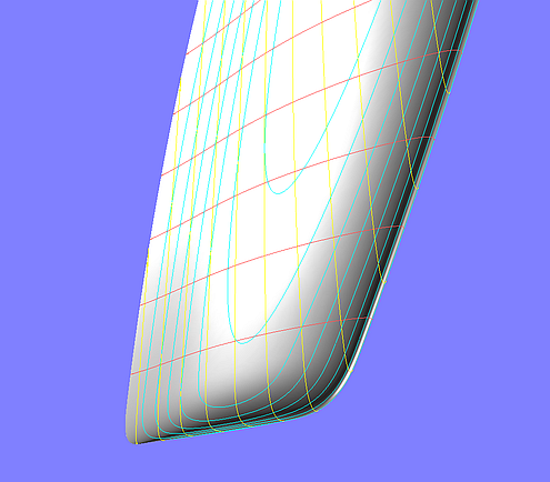 In tutorial 17 "B-spline Curves and B-spline Surfaces" the construction of a specially shaped bottom surface of a powerboat hull is described (model bottom.ms2). The design requirement is that aft of a fixed longitudinal position the buttocks run exactly straight.