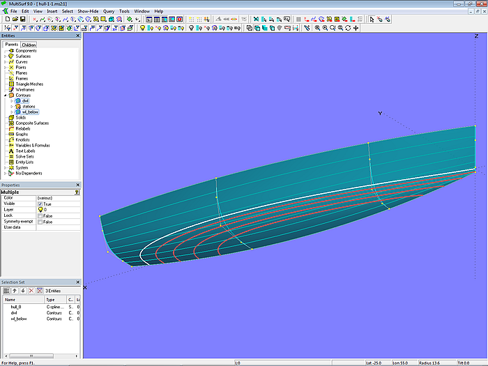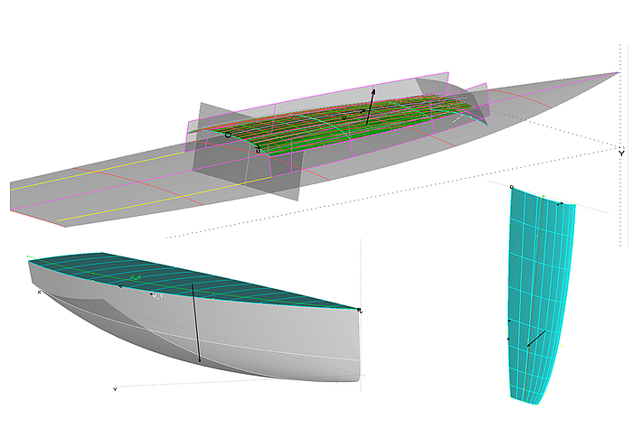 If the cabin top is turned upright and the mcs are slightly modfied, the geometry of a boat hull is created. When modeling a hull, it can happen that waterlines are also concave in the area of the transition between stem and bottom contour.