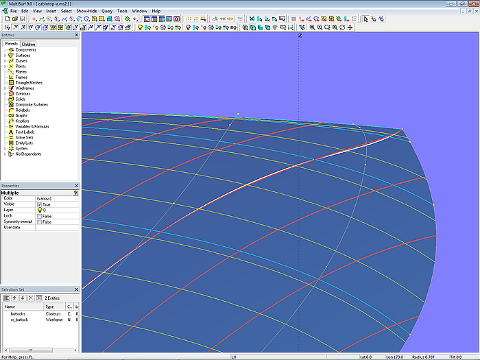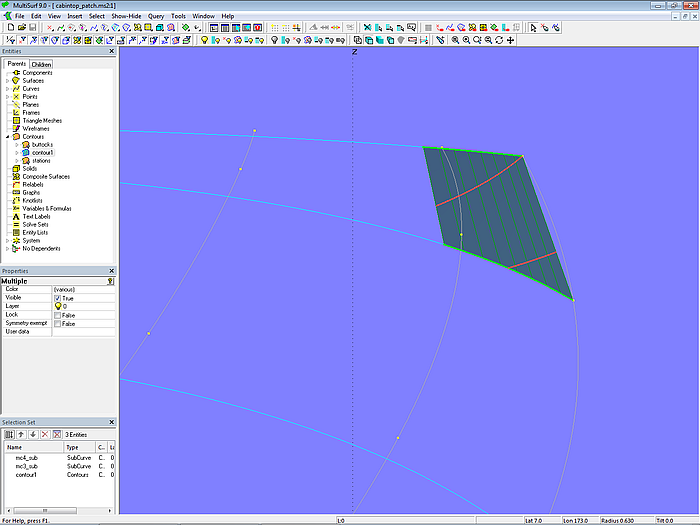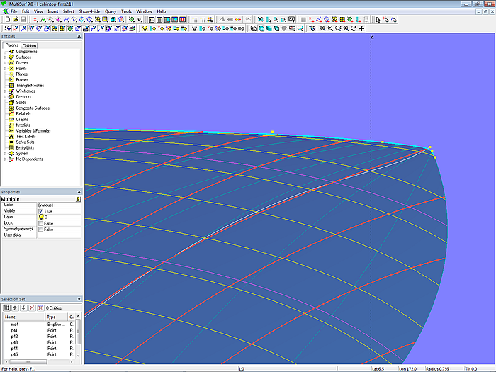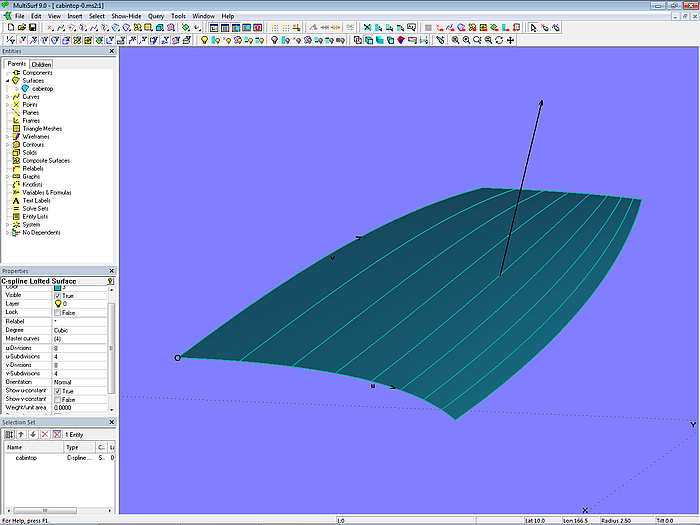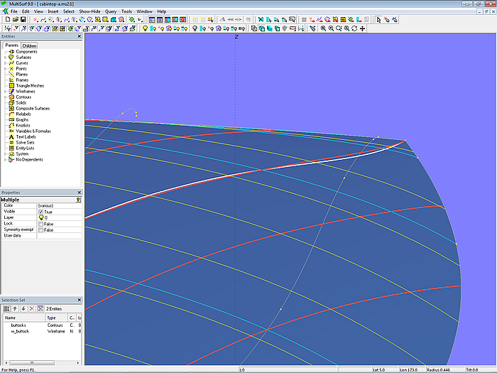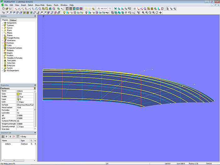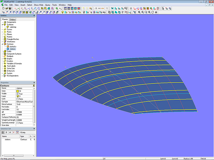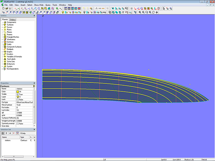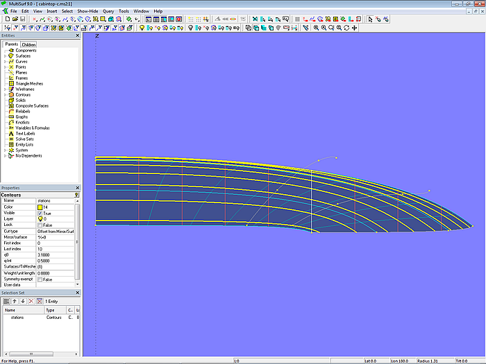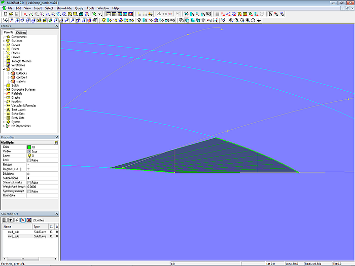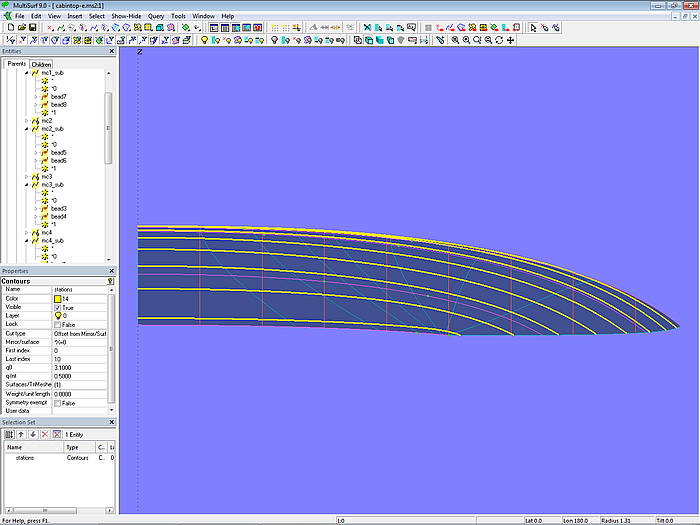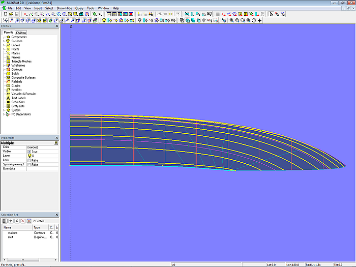 Let us look at the base model cabintop-0.ms2 and display its lofting curves (u-parameter curves).