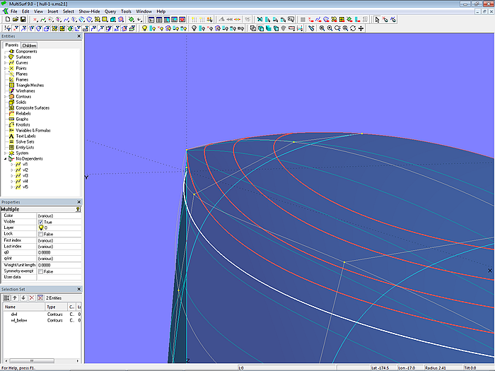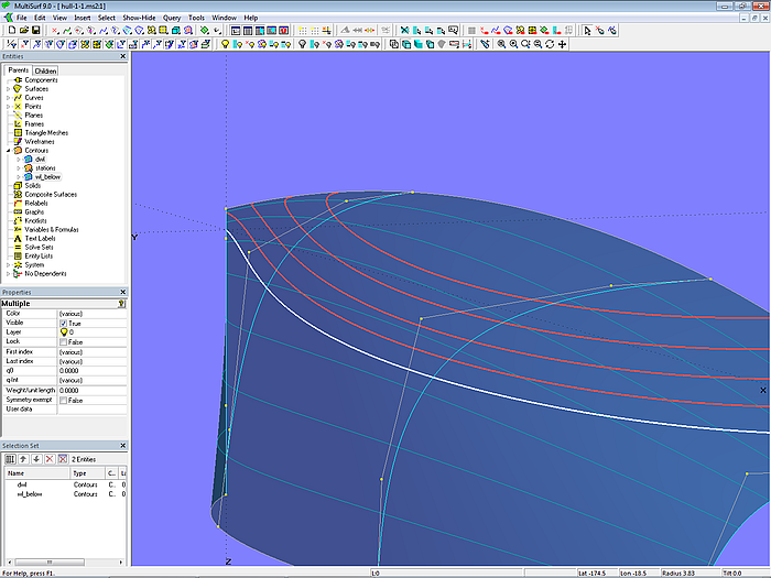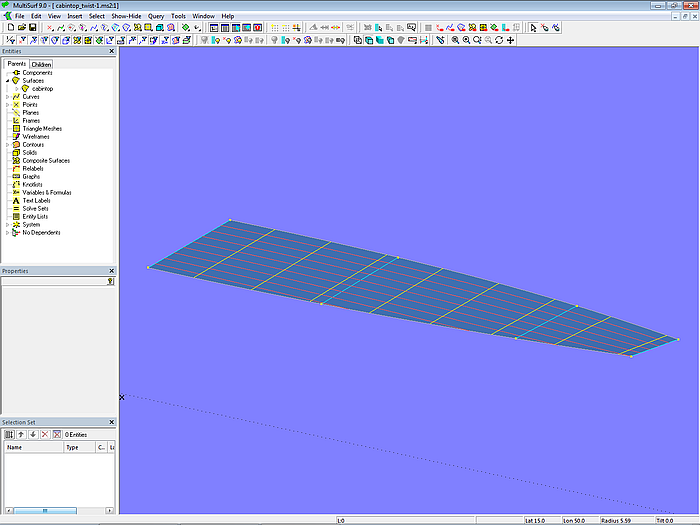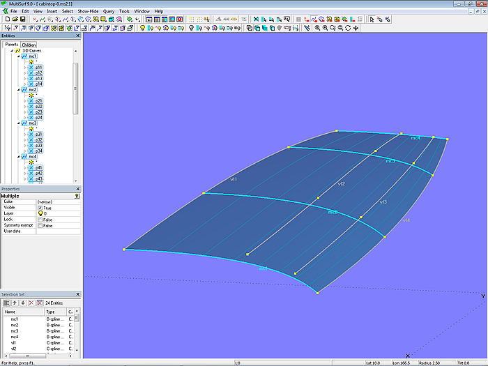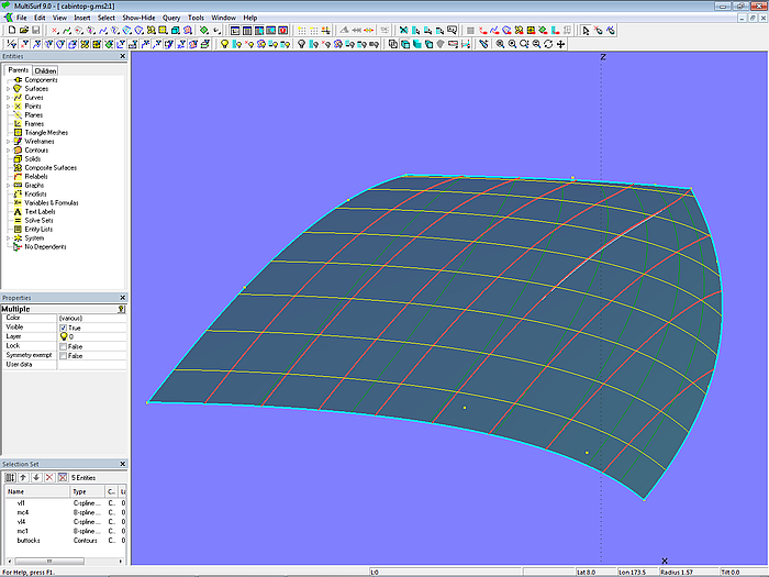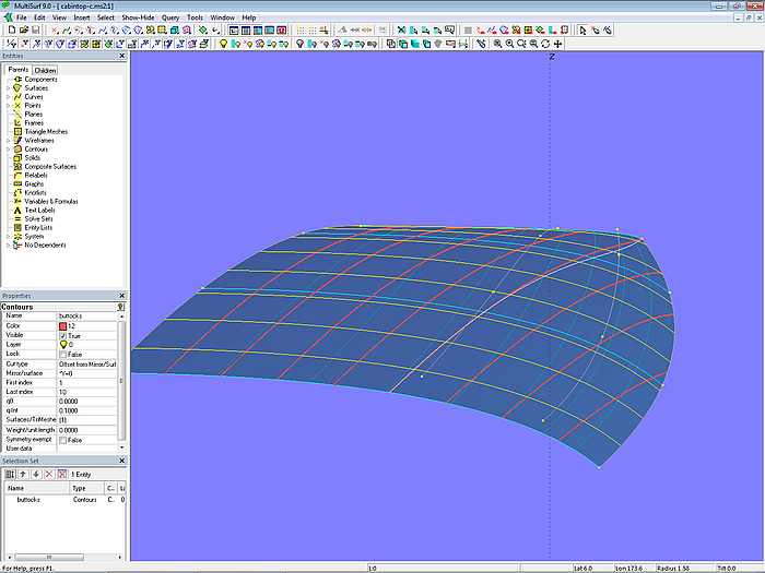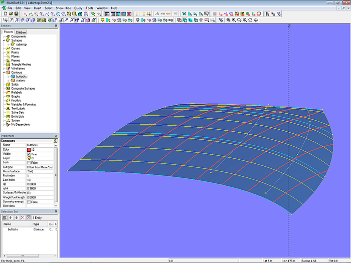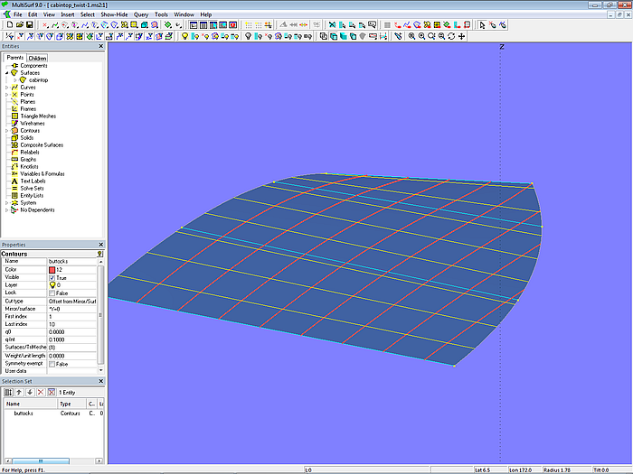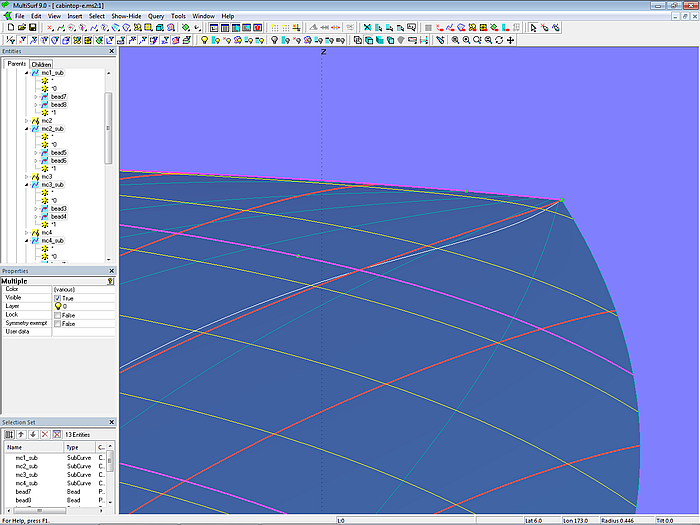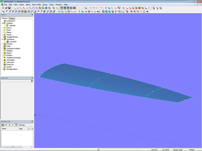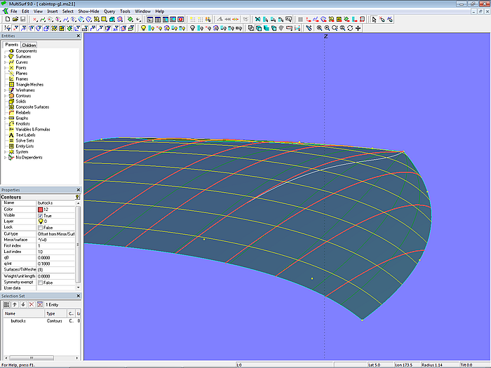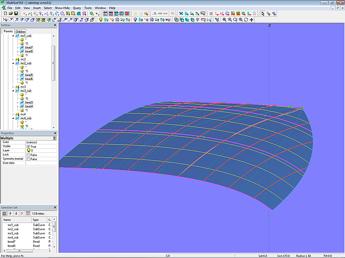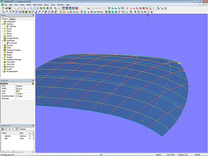 Let us look at the base model cabintop-0.ms2 and display its lofting curves (u-parameter curves).