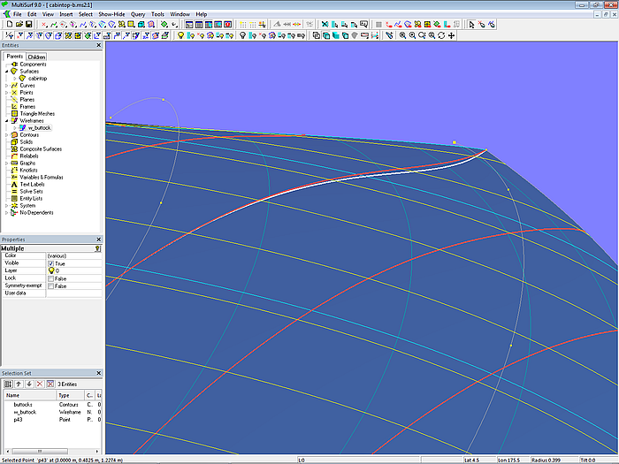In model cabintop-g1.ms2, mc4 is defined with p44 as a quadruple point (i.e. p44 is selected 4 times in the list of its control points). This changes the parameter distribution of mc4 considerably and the lofting curves (here: v-parameter curves) shift towards the front outer corner. The buttock is almost no longer hollow, but stations are strongly catenary arch shaped.