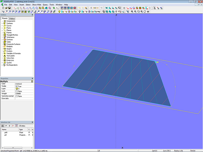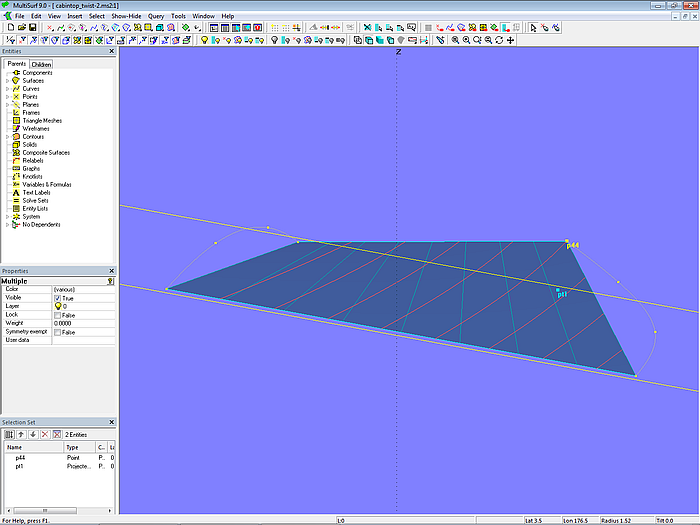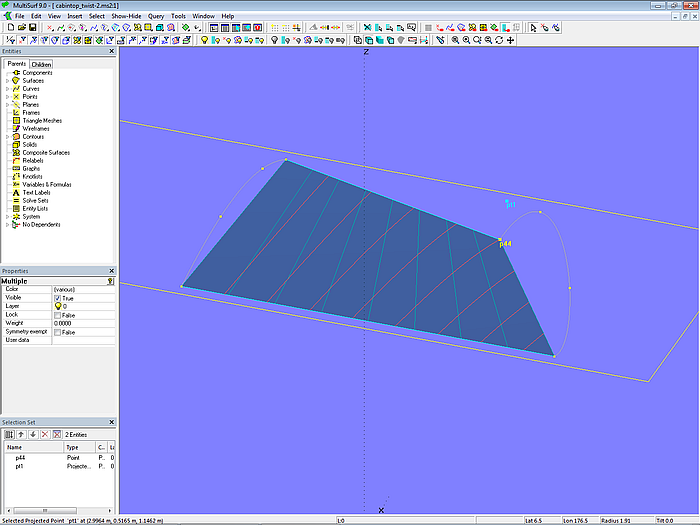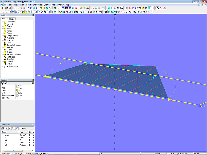 Let us simplify the model even further. Only mc1 and mc4 should support the surface. This is shown in model cabintop_twist-2.ms2. Inside and outside edges are straight. The C-spline Lofted Surface now matches a Ruled Surface. In addition, there is the 3-point Plane plane1 supported by the two rear corner points (p11, p14) and the front inner corner point (p41). Point p44 is projected onto plane1 as Projected Point pt1.