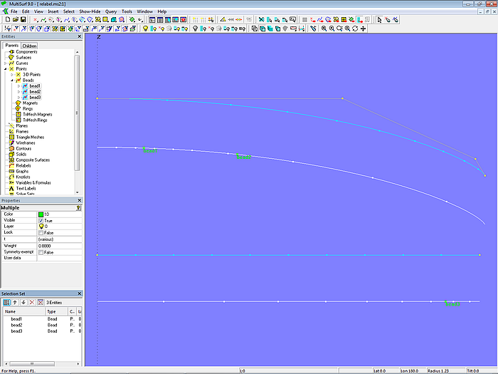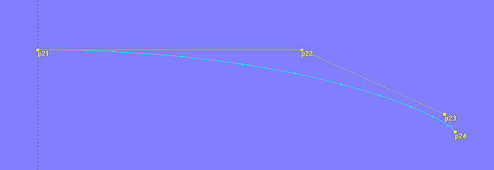 However, a curve can also be re-divided; other t-parameter values can be assigned to the curve points (re-parameterization). So that, for example, in the case of a Line entity, the curve point halfway does not have the t-value = 0.5 (natural label), but t = 0.75 (relabel). MultiSurf has the entities Relabel and SubCurve for this purpose. The shape of the curve does not change when relabeling, the position of the curve points also remains the same, only the associated t parameter value is changed.