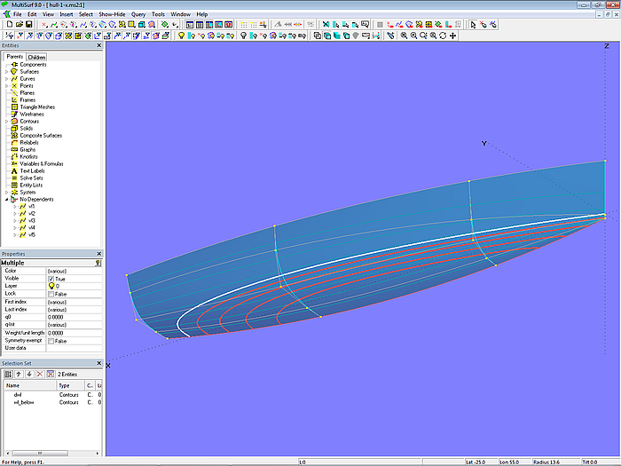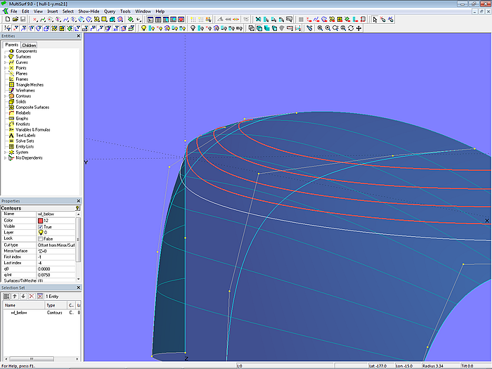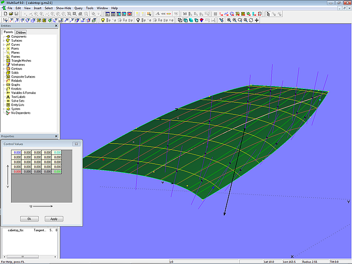 This tutorial is based on the comment of a MultiSurf user who, while modeling a simple sailboat cabin, noticed that cuts parallel to the centerplane through the top of the cabin are concave (hollow) in the corner of front and outer edge.