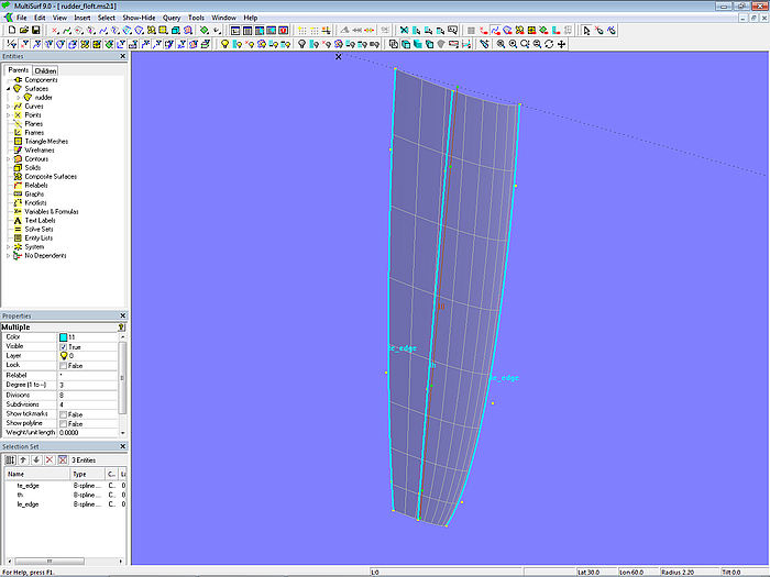 Tutorial 6, Modeling a Rudder in MultiSurf, reports on methods and strategies for modeling rudders. A section deals with shape effects on Foil Lofted Surfaces caused by different parameterization of the master curves. Several methods are presented to control the shape of the lofting curves.
