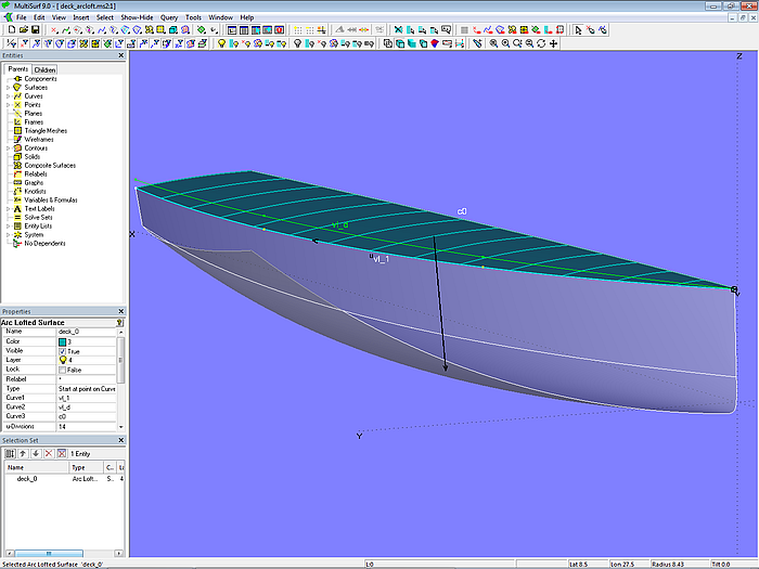 Tutorial 13, Decks and Superstructures, gives an example of how to create a deck with an Arc Lofted Surface. When constructing this model, special attention is paid to the same parameterization of the master curves. In model deck_arcloft.ms2 mc1 is the top edge of the hull (C-spline Lofted Surface), mc2 is a relative C-spline Curve with the same number and longitudinal position of cps, and mc3 (Projected Curve) is the projection of mc2 onto the centerplane. Thus, an identical parameter distribution of the mcs is hardwired in the model and the lofting curves (arcs) all run in transverse planes. Which would not be the case with unequal parameterization of the mcs.