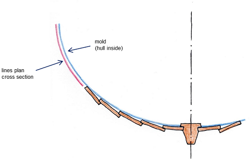 The mold in the middle of the hull is divided according to the number and width of the planks. The other molds receive the same relative division. Connecting corresponding division points creates longitudinal curves for the upper edges of the planks' inner sides. These curves are referred to below as plank seams.