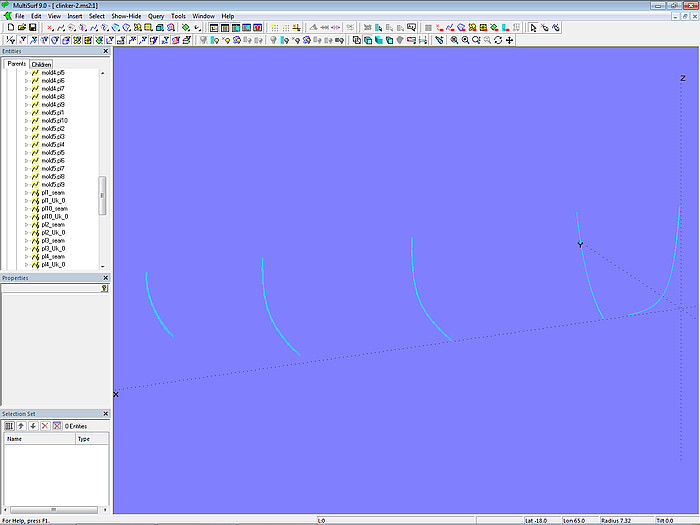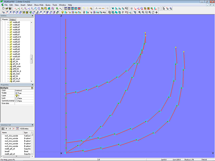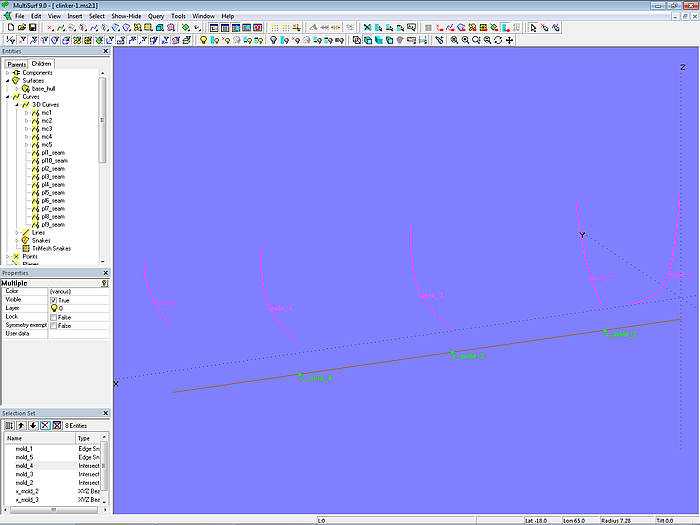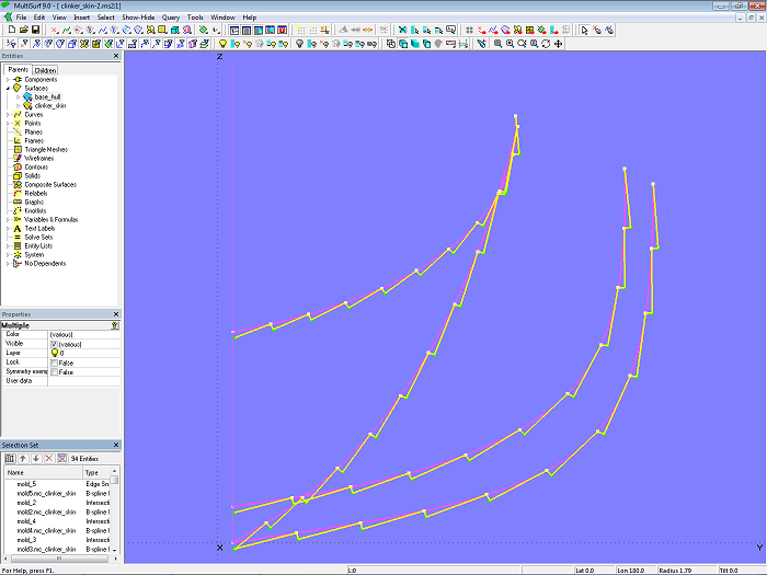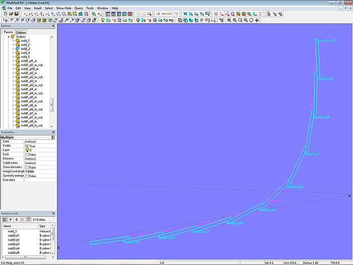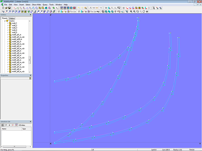 The C-spline Lofted Surface clinker_skin is supported by 7 mold curves. The Component cl_skin_12planks.mc2 is used for this purpose. To apply it, first select the mold points of the mold in question, then choose the Component via File/ Component/ Load, confirm the Resolving Parents dialog with OK, and the zigzag B-spline master curve for the mold is generated.