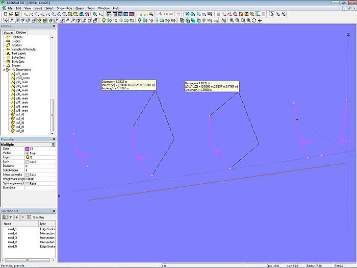 To do this, first place Rings at the beginning (t = 0) (m1_r0, m2_r0, ... m5_r0) and at the end (t = 1) (m1_r10, m2_r10, ... m5_r10) of each mold. If you select a matching pair, you can display the arc-length using Tools/ Measure/ Distance (or the corresponding button in the Toolbar). For example, for mold 3 the arc-lenght is 1.2918 m and for mold 4 it is 1.1937 m.