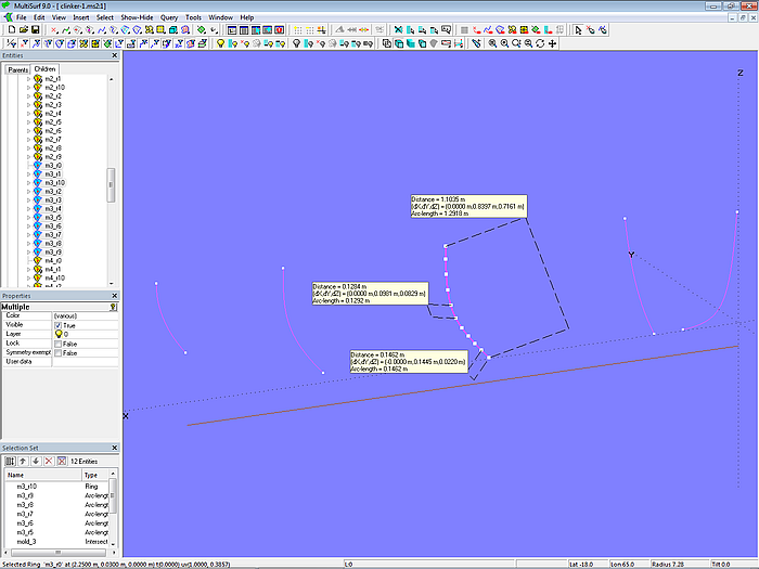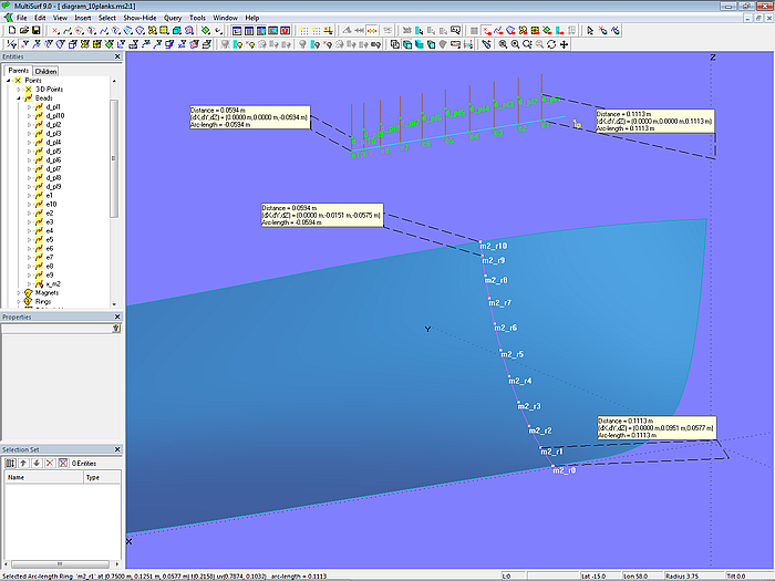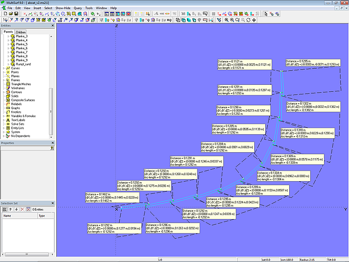 Let us now check how the plank layout looks from the outside with the underlying assumptions (the mold point distance is equal to the girth divided by the number of planks, and the landing is added at the first mold point). Using Tools/ Measure/ Distance the distances between the mold points and the distances between the visible plank edges are displayed. For example, for plank 3 between Copy Point mall3.pl2_pt2 and Arc-length Bead mall3.pl2_e1.