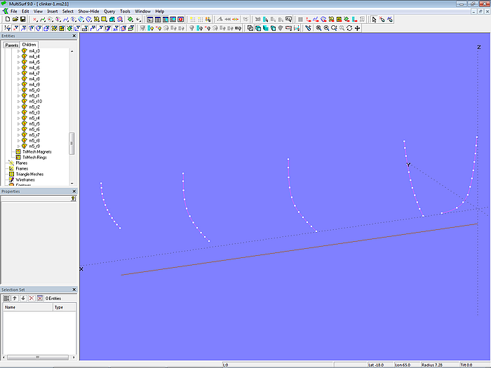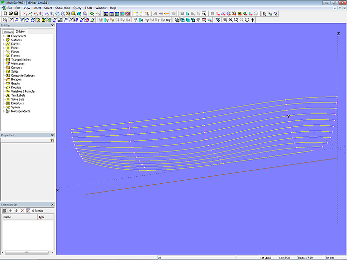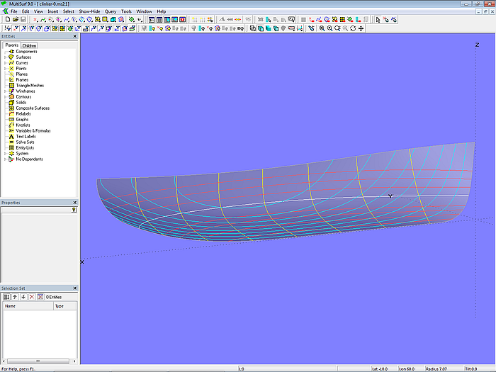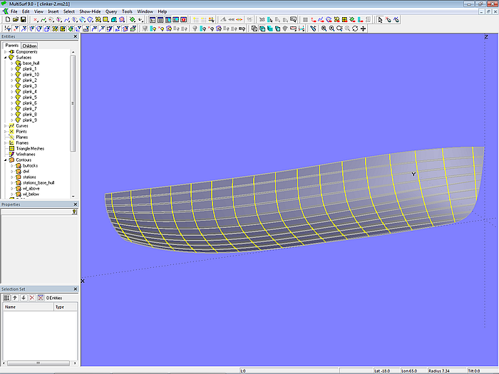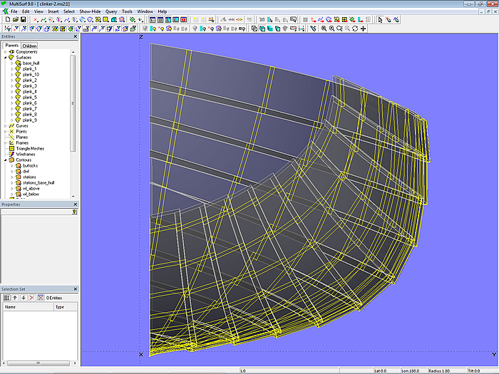 Since in what follows only the hull surface is required from model clinker-0.ms2, contours of stations, waterlines, etc. are deleted and the model is saved under the file name clinker-1.ms2.